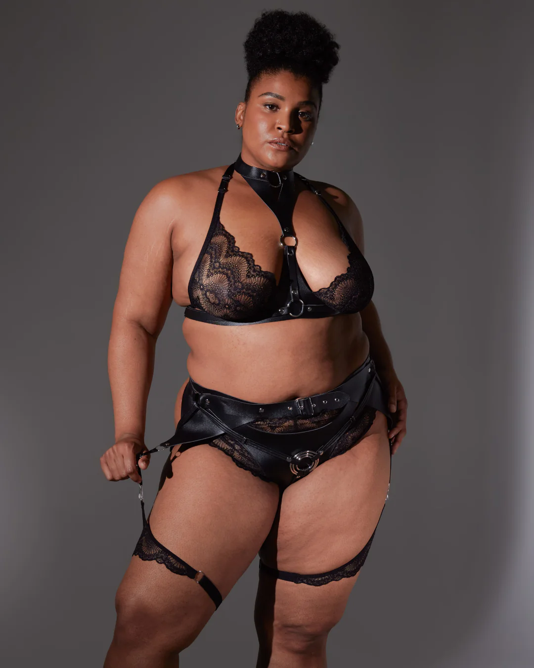 Can be worn as a harness alone or with the vegan leather and lace Heroine Panty (pictured).